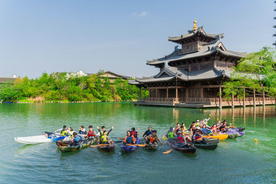 To welcome the summer holidays, a peak season for diverse travel demands such as family and graduation trips, Puyuan Fashion Town in Tongxiang, Zhejiang province, has launched a variety of activities including water fights, boating, open-air karaoke, pool parties, paddling, aromatherapy and singing bowl meditation, offering visitors a rich and refreshing vacation experience.