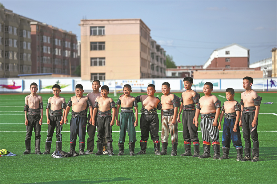 The young wrestlers at Degjiin's primary school proudly display their physique on the playground as they dream of achieving wrestling glory.[Photo provided by Lian Zhen/Li Zhipeng/Ma Jinrui/Xinhua]