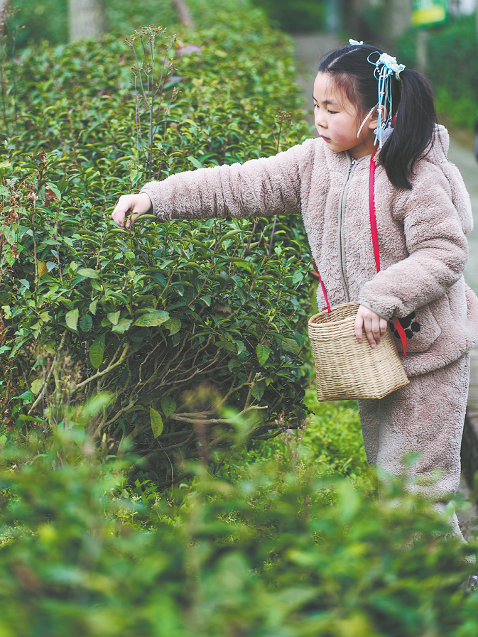 Primary school pupils learn how to pick tea leaves at the Dingxin tea garden on March 14. XIA SHOU'AN/JU ZHIQIN/FOR CHINA DAILY