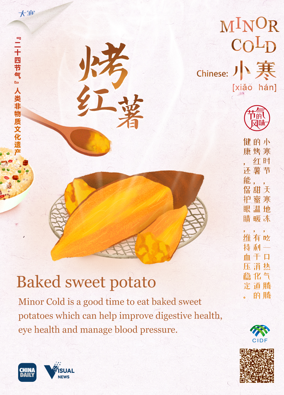 Mutton hot pot, chestnuts and baked sweet potato are three recommended foods for Minor Cold. According to traditional Chinese medicine theories, people need to eat food that contains more yang energy to prevent cold from harming their organs. The yang energy in the three types of food is strengthened through their method of cooking: boiling, stir frying and baking.