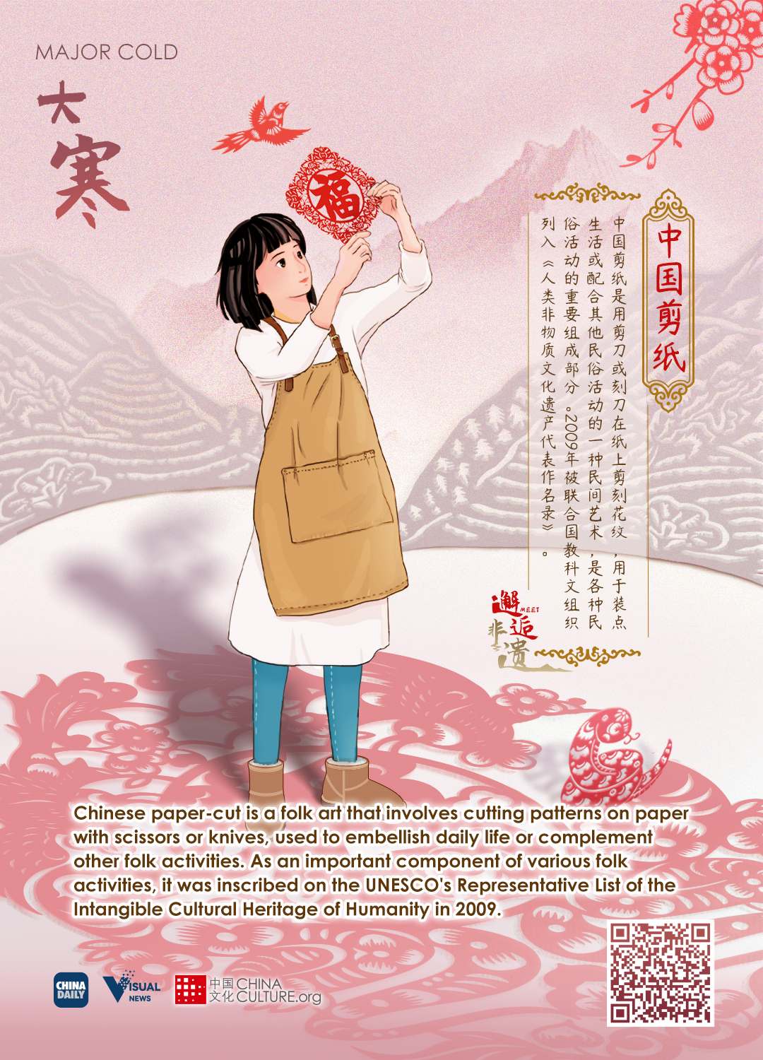 The traditional Chinese solar calendar divides the year into 24 solar terms. Major Cold (Chinese: 大寒), the 24th solar term, begins this year on Jan 20 and ends on Feb 2.