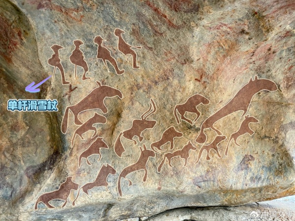 An ancient cave painting discovered in Altay, Xinjiang Uygur autonomous region, depicts human figures sliding on small platforms over slopes while herding animals. Historians estimate the painting to be between 5,000 and 10,000 years old, solidifying Altay's status as the "the ancient cradle of skiing".