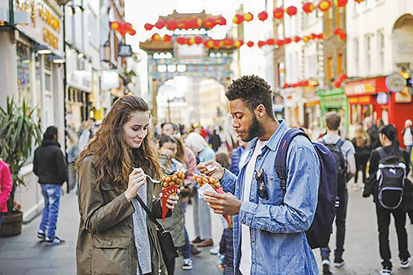 People enjoy bubble waffles in London's iconic Chinatown.[Photo provided to China Daily]