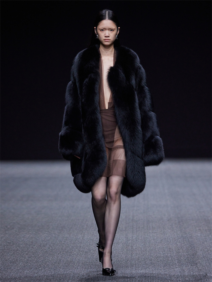 Supermodel Liu Dan opened and closed the show astride a black stallion, symbolizing the brand's vision of women as conquerors. Her armor-like coat and sharp tailoring juxtaposed delicate sheer overlays, embodying the "gorgeous genius" ethos of strength intertwined with grace.