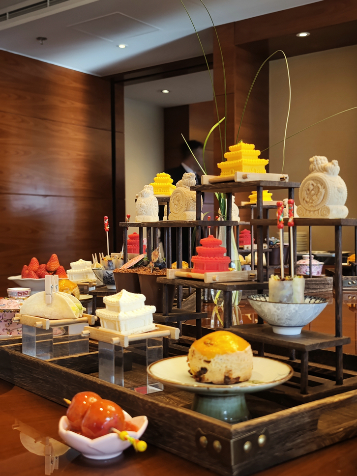 The afternoon tea set showcases a selection of desserts and snacks designed to immerse guests in the authentic flavors of Beijing. The items are beautifully crafted to resemble landmarks along the axis, such as the Temple of Heaven and the Drum Tower, as well as feature stone drums adorned with lion carvings found in traditional residential buildings. The flavors pay homage to the city's iconic snacks and beverages, including candied hawthorns, pea cakes, and jasmine tea.