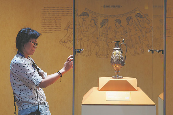 Among the highlighted artifacts are exotic treasures found in the tomb of Li Xian, an official of the Northern Zhou (557-581) period. While the inscriptions, murals and painted pottery figurines in the tomb represented the continuation of Han-style burial customs, objects such as the gilded silver ewer and the studded glass bowl are all rare imports from Central and Western Asia.