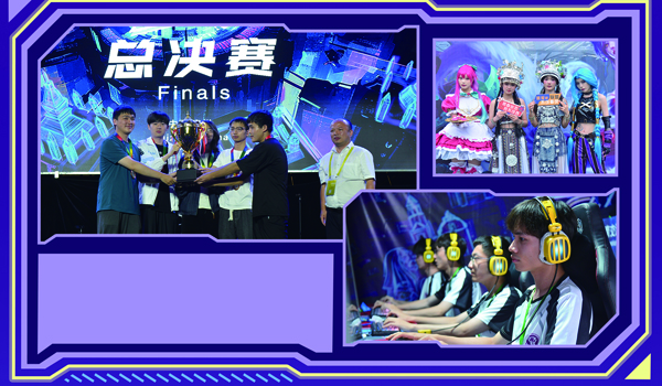 Above: The winning team from Yunnan University holds their trophy at an e-sports tournament featuring players from China, ASEAN countries, Japan, and South Korea, held from July 24 to 27 in Guizhou. Above right: Audience members in cosplay and traditional Miao attire pose at the tournament venue. Right: Tsinghua University students compete intensely during the event. [Photo provided to China Daily]